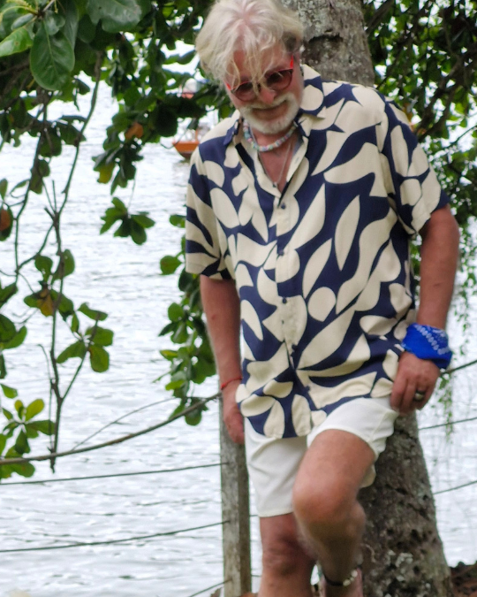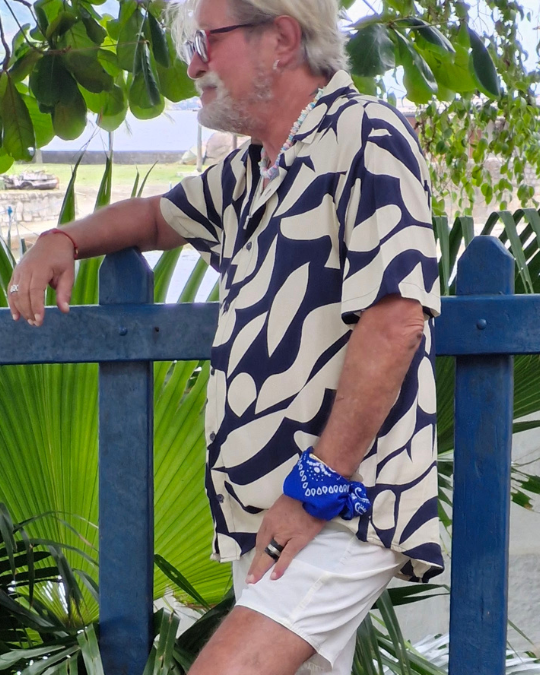 Camisa de viscose digital com estampa branca e azul manga curta